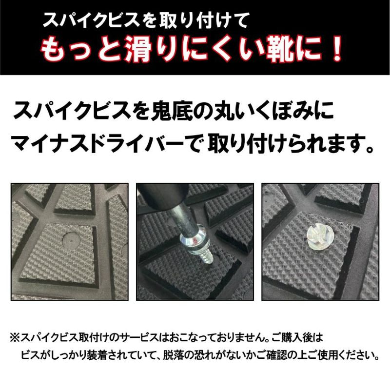 スパイクビスを取り付けてもっと滑りにくい靴に! スパイクビスを鬼底の丸いくぼみにマイナスドライバーで取り付けられます。 ※スパイクビス取付けのサービスはおこなっておりません。ご購入後はビスがしっかり装着されていて、脱落の恐れがないかご確認の上ご使用ください。