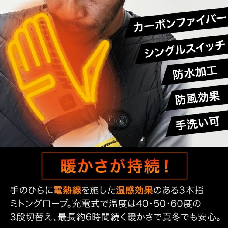 手首部分にバッテリー、手のひらに電熱線(カーボンファイバー)を施した温感効果のあるミトン型手袋です。