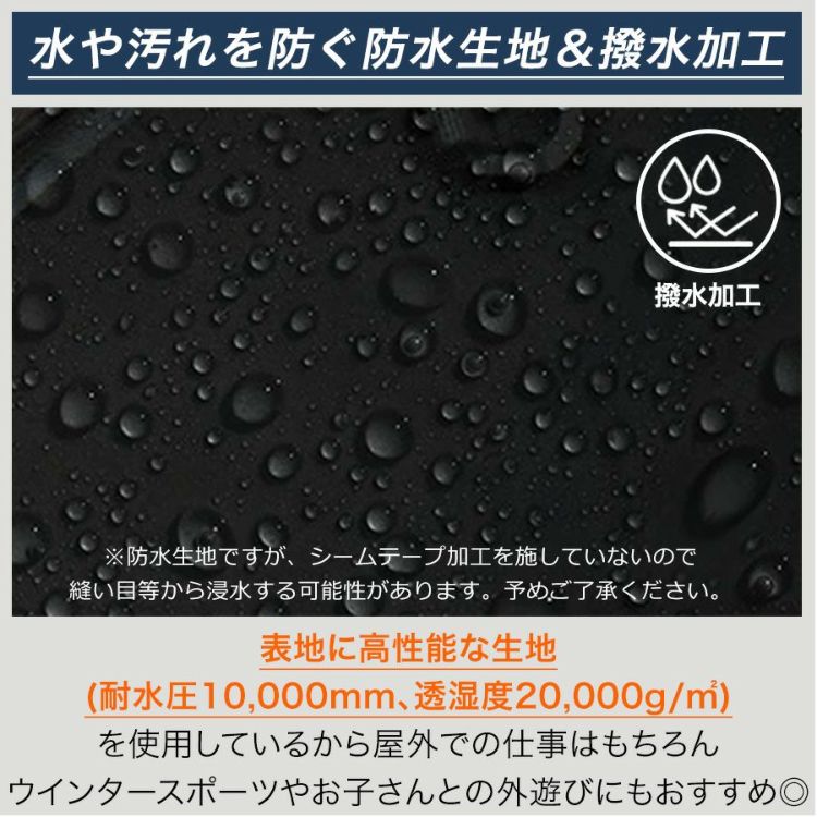 撥水加工を施した高性能生地(耐水圧10,000mm・透湿度20,000g/m2)で、小雨や雪をしっかりガード。