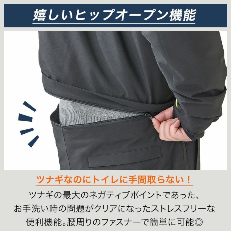 ヒップオープン機能:つなぎでもトイレが簡単にできる便利設計