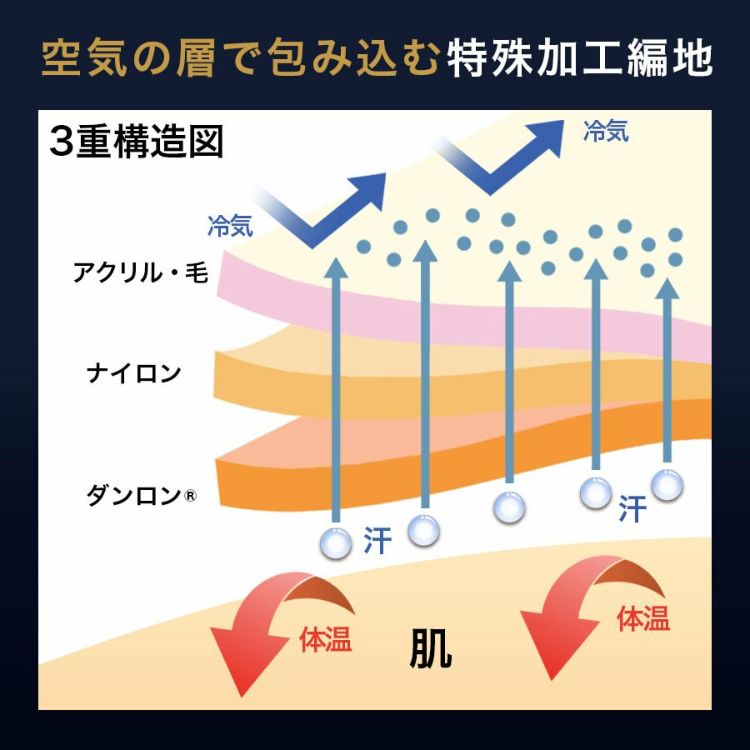 保温力を高めるため、特殊3重構造で丁寧に編みあげた生地を使用しています。 体温によってあたためられた暖気を外に逃がさず、外からの冷気をシャットアウトするため、最高の保温力を誇ります。