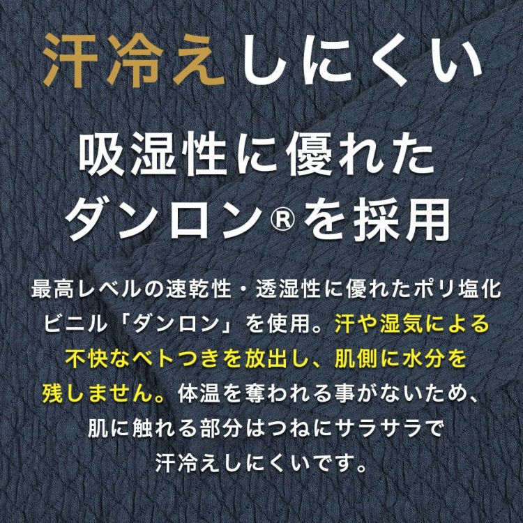 速乾性・透湿性に優れたポリ塩化ビニル「ダンロン」を使用。汗や湿気による不快なベトつきを放出し、肌側に水分を残しません。 体温を奪われる事がないため、肌に触れる部分はつねにサラサラで汗冷えしにくいです。