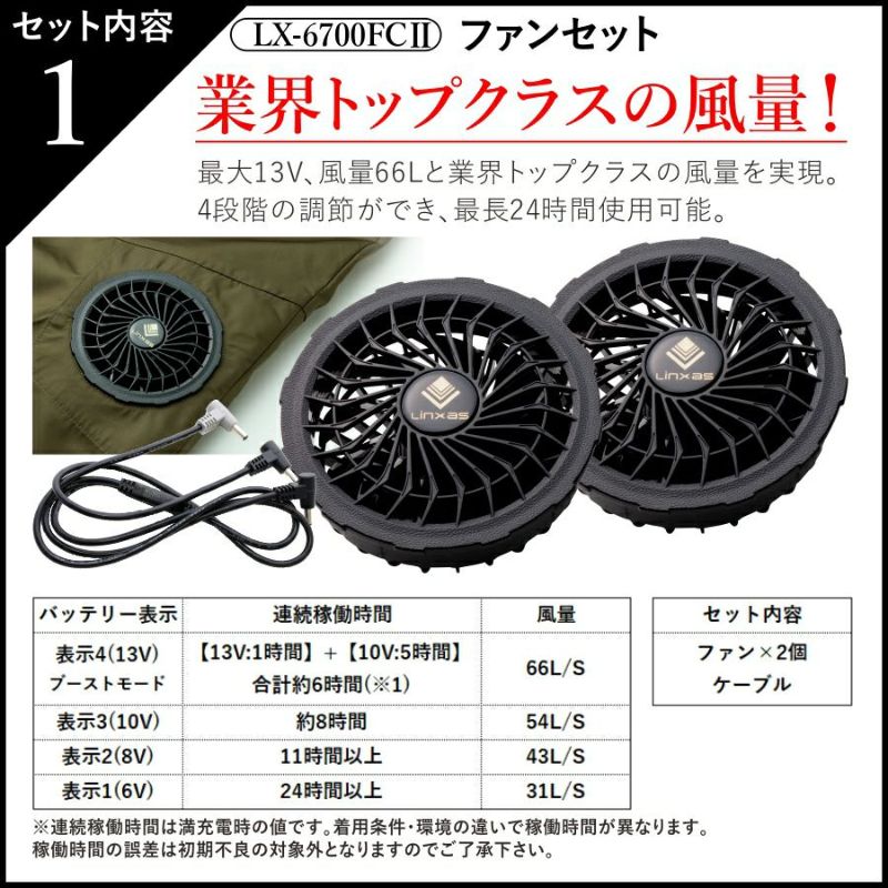 すぐに使えるウェア・バッテリー・ファンの3点コンプリートセット。