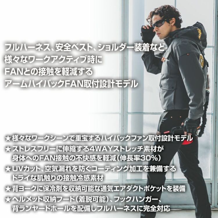 フルハーネス、安全ベスト、ショルダー装着など様々なワークアクティブ時にファンとの接触を軽減するアームハイバックFAN取付設計モデル