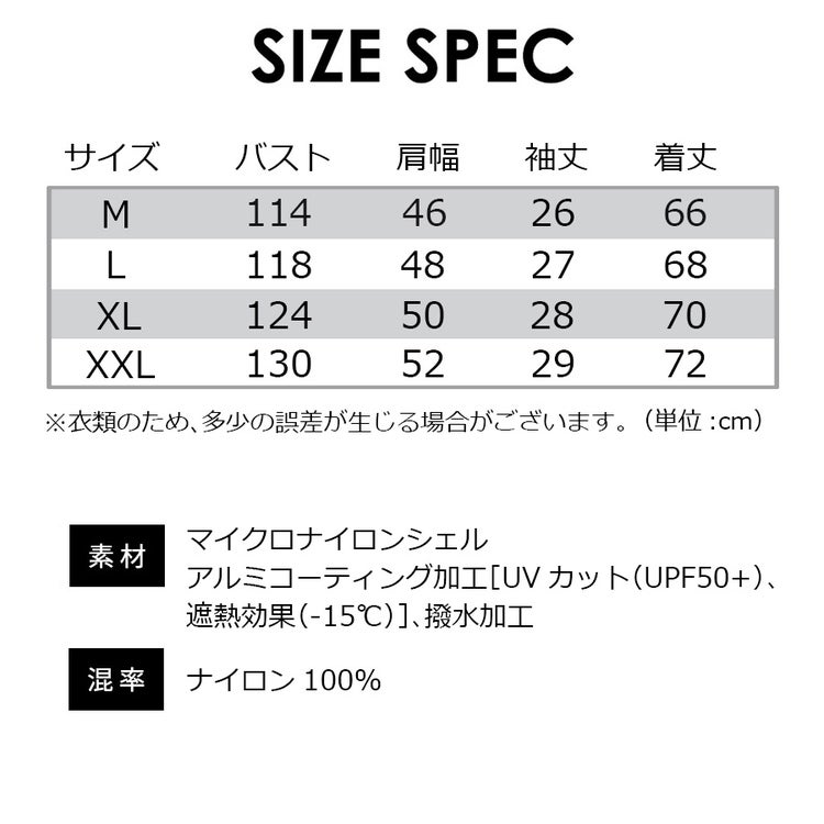 アルミコーティング加工[UVカット(UPF50+)、遮熱効果(-15℃)]、撥水加工
