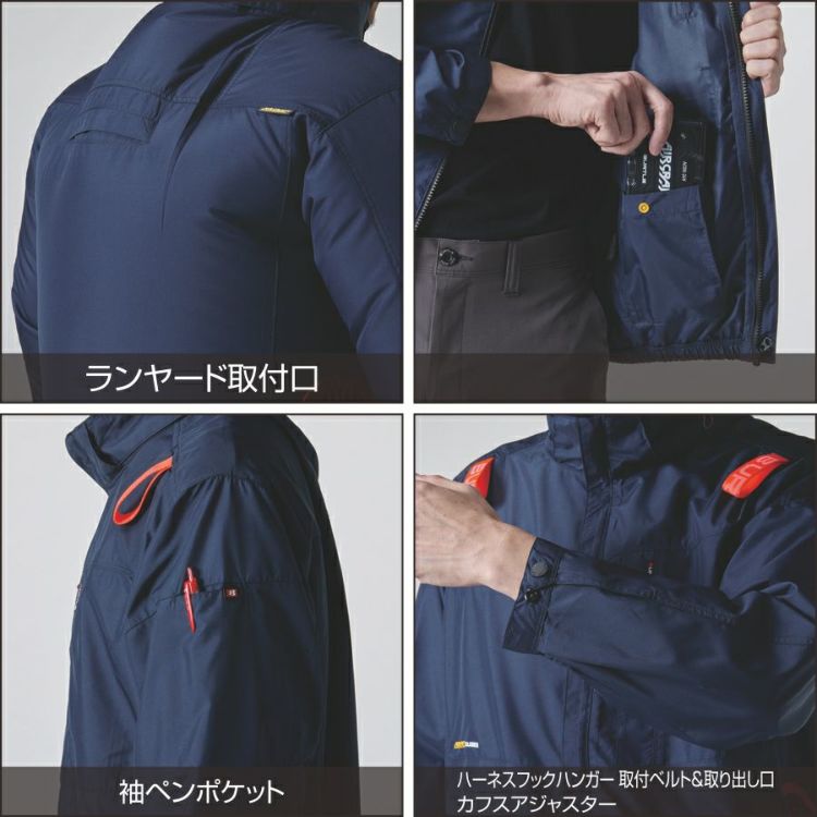 ヘルメット収納フード(着脱可能)、フックハンガー、背ランヤードホールを配備しフルハーネスに完全対応