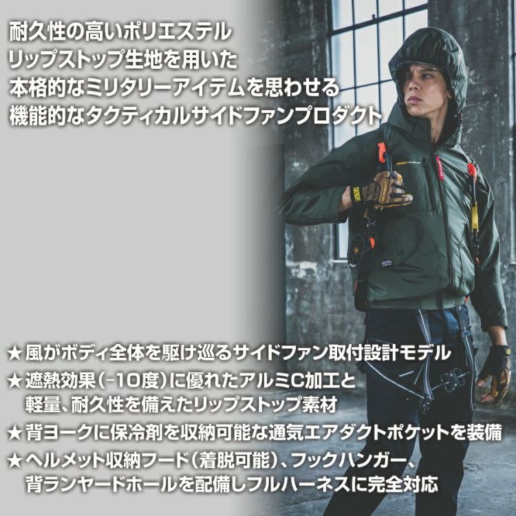 耐久性の高いポリエステルシップストップ生地を用いた本格的なミリタリーアイテムを思わせる機能的なタクティカルサイドファンプロダクト