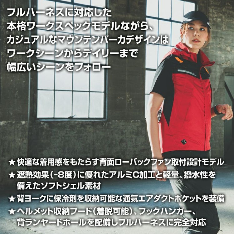 ヘルメット収納フード(着脱可能)、フックハンガー、背ランヤードホールを配備しフルハーネスに完全対応