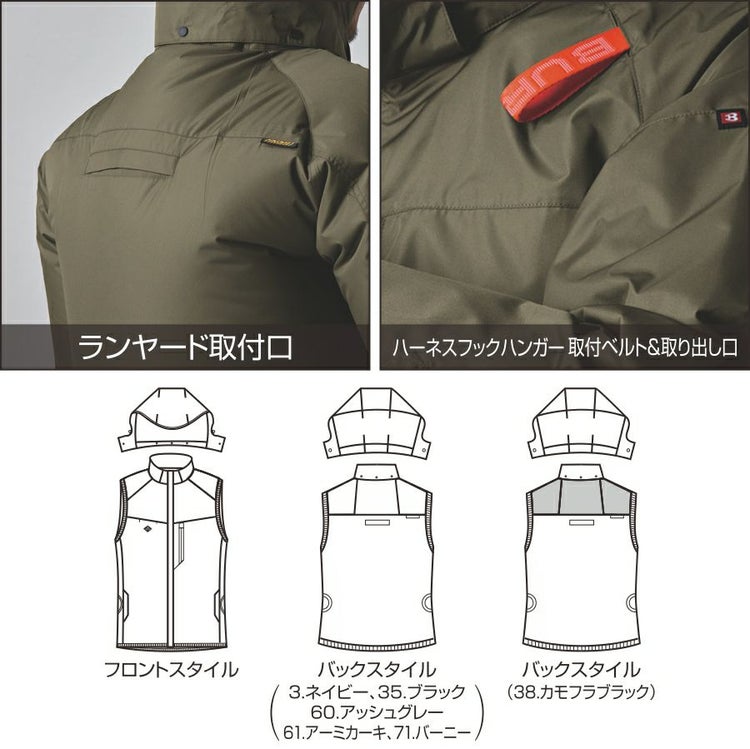 ヘルメット収納フード(着脱可能)、フックハンガー、背ランヤードホールを配備しフルハーネスに完全対応