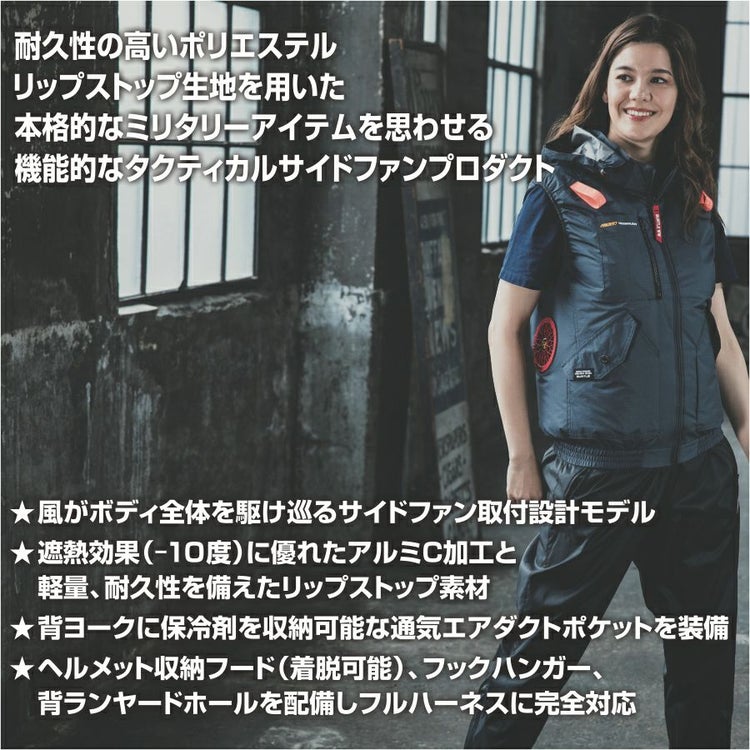 耐久性の高いポリエステルシップストップ生地を用いた本格的なミリタリーアイテムを思わせる機能的なタクティカルサイドファンプロダクト
