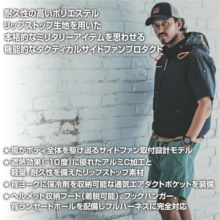 耐久性の高いポリエステルシップストップ生地を用いた本格的なミリタリーアイテムを思わせる機能的なタクティカルサイドファンプロダクト