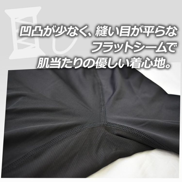 平らなフラットシーム縫製なので、縫い目がゴロつかず、肌当たりも優しく着心地も◎