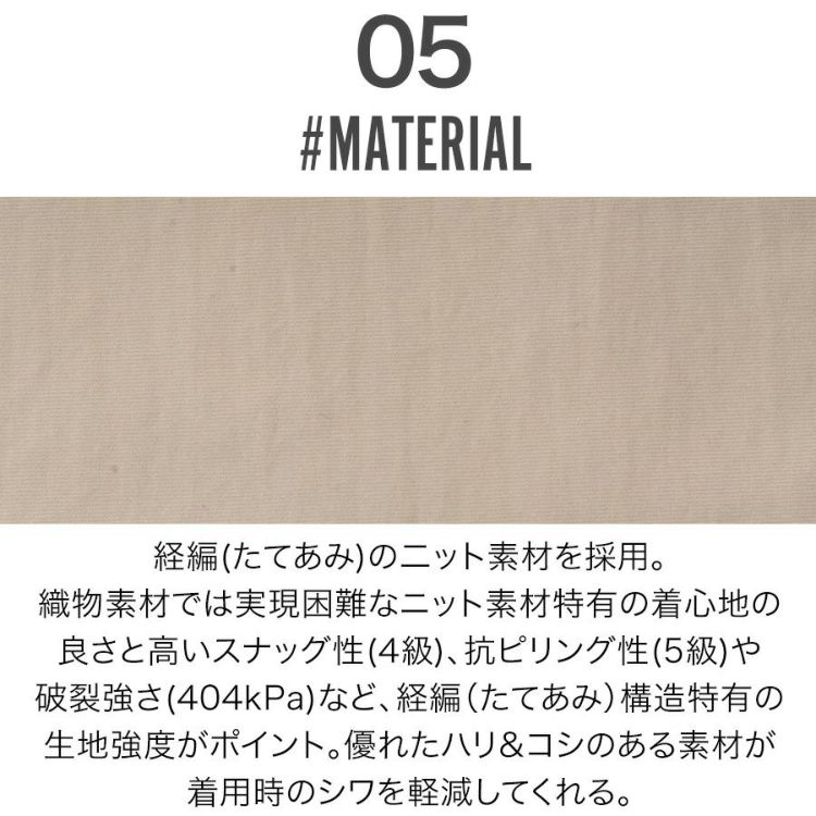経編(たてあみ)の二ット素材を採用し、織物素材では実現困難なニット素材特有の着心地の良さと、高いスナッグ性(4級)、 抗ピリング性(5級)や破裂強さ(404kPa)など、経編(たてあみ)構造特有の生地の強度を併せ持ち、優れたハリコシ感のある素材が着用時のシワを軽減します。