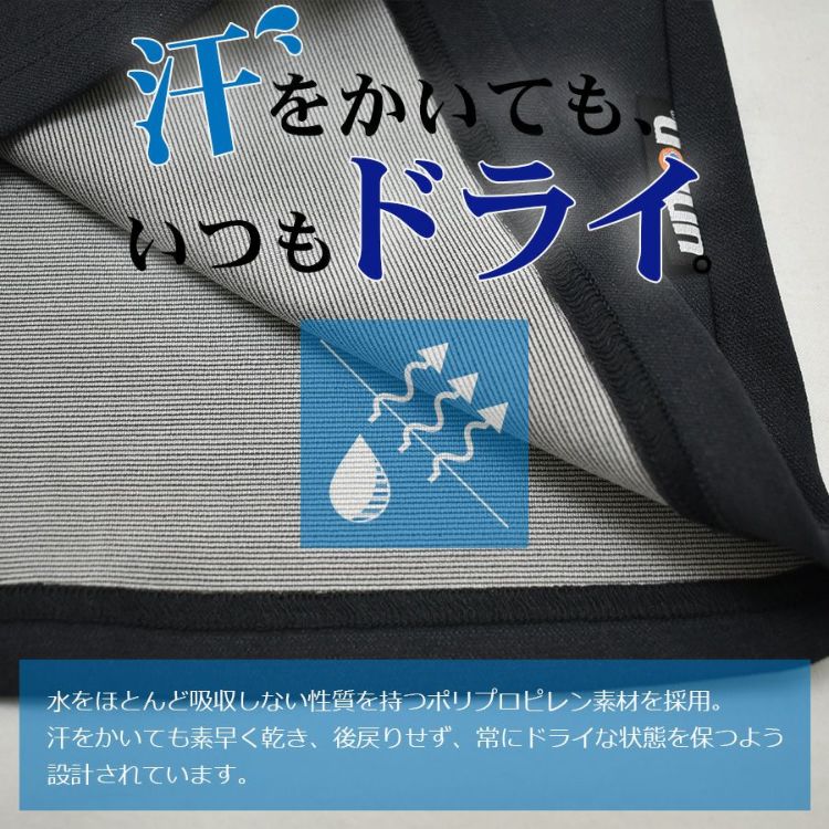 ・水をほとんど吸収しない性質を持つポリプロピレン素材を採用し、汗をかいても素早く乾き、後戻りせず、ドライな状態を保つよう設計されています。