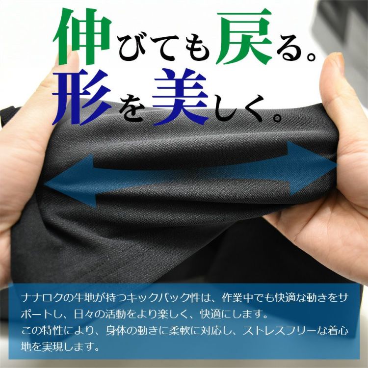 ・生地が持つキックバック性は、作業中でも快適な動きをサポートし、日々の活動をより楽しく、快適にします。この特性により、身体の動きに柔軟に対応し、ストレスフリーな着心地を実現します。