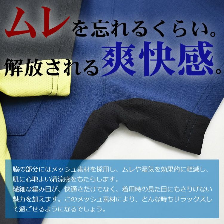 ・脇の部分にはメッシュ素材を採用し、ムレや湿気を効果的に軽減し、肌に心地よい清涼感をもたらします。