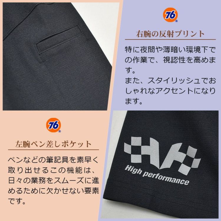 ・襟裏・右袖には夜間の視認性を高め、オシャレな76ロゴの反射プリント
