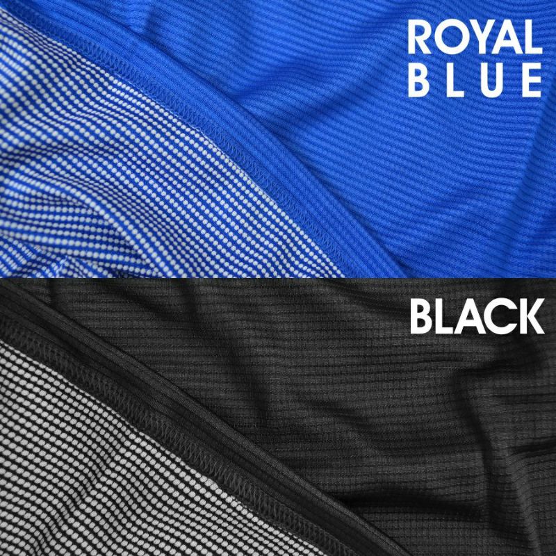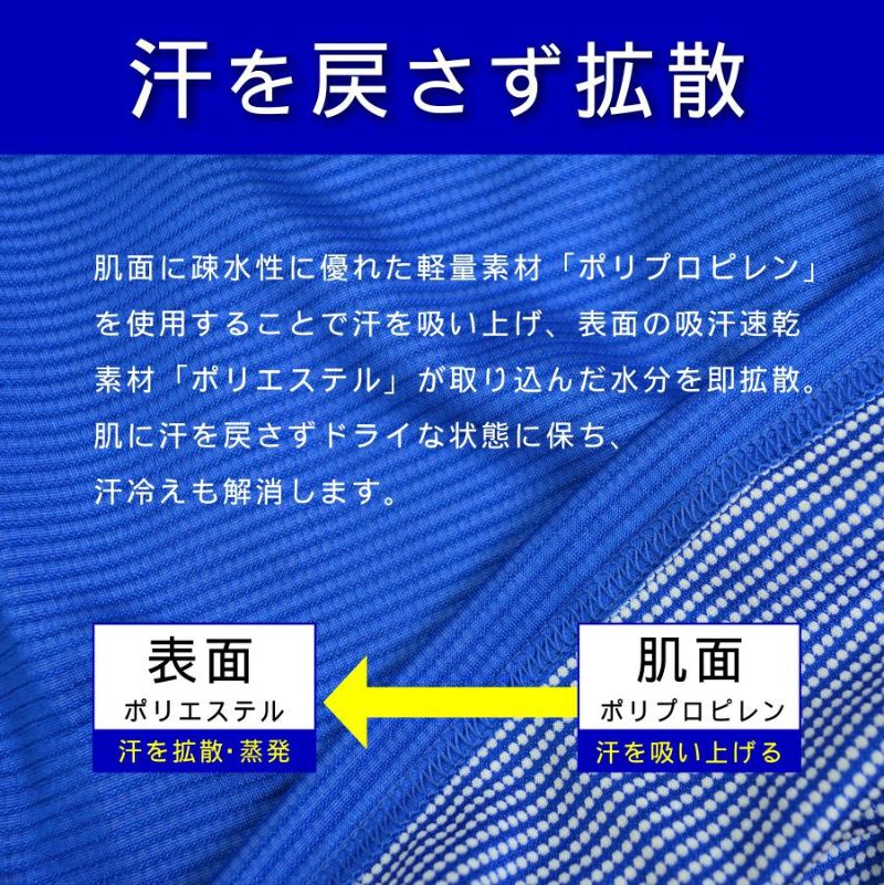 肌面のポリプロピレンが汗を素早く吸い上げ、表面のポリエステルが即拡散・蒸発させることで 汗が肌に戻らない吸汗速乾を実現。