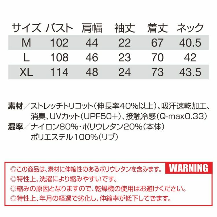 ストレッチトリコット(伸長率40%以上)、吸汗速乾加工、消臭、UVカット(UPF50+)、接触冷感(Q-max0.33)