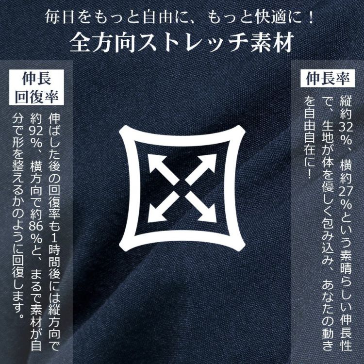 縦約32%、横約27%という素晴らしい伸長率で、生地が体を優しく包み込み、あなたの動きを自由自在にします。伸ばした後の回復率も1時間後には縦方向で約92%、横方向で約86%と、まるで素材が自分で形を整えるかのように回復します。