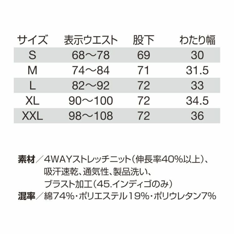 4WAYストレッチニット(伸長率40%以上)、吸汗速乾、通気性、製品洗い、ブラスト加工(インディゴのみ)