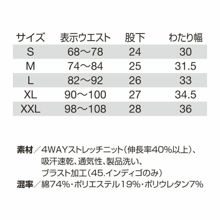 4WAYストレッチニット(伸長率40%以上)、吸汗速乾、通気性、製品洗い、ブラスト加工(インディゴのみ)