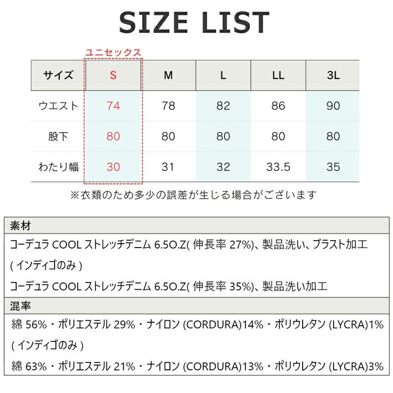 混率: 綿56%・ポリエステル29%、ナイロン(CORDURA)14%、ポリウレタン(LYCRA)2%(インディゴのみ)