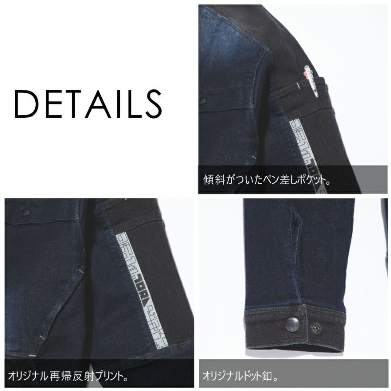 伸長率約70%、回復率約90%の横伸びストレッチを主材にして摩擦する部分にコーデュラ(R)デニムで補強を加えた商品。