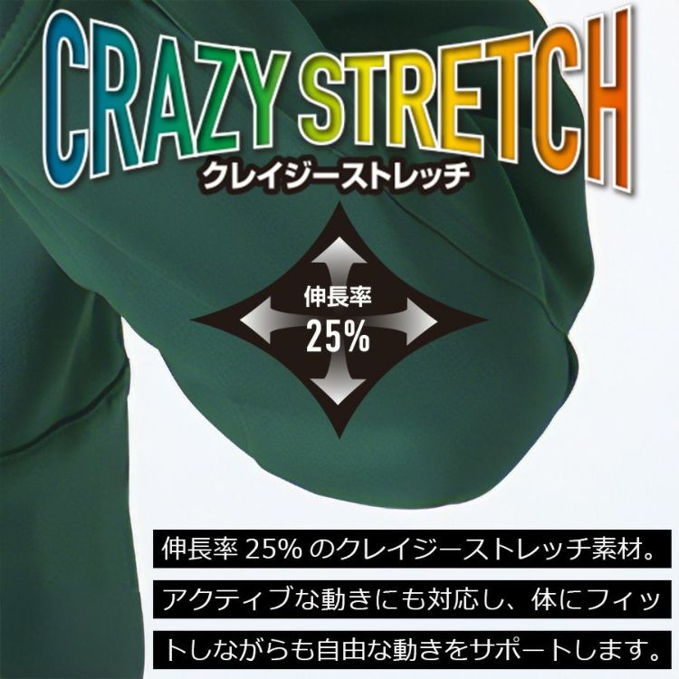 伸長率25%のクレイジーストレッチ素材。 アクティブな動きにも対応し、体にフィットしながらも自由な動きをサポートします。