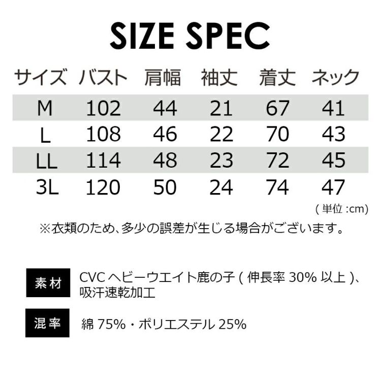 素材/CVCヘビーウエイト鹿の子(伸長率30%以上)、吸汗速乾加工