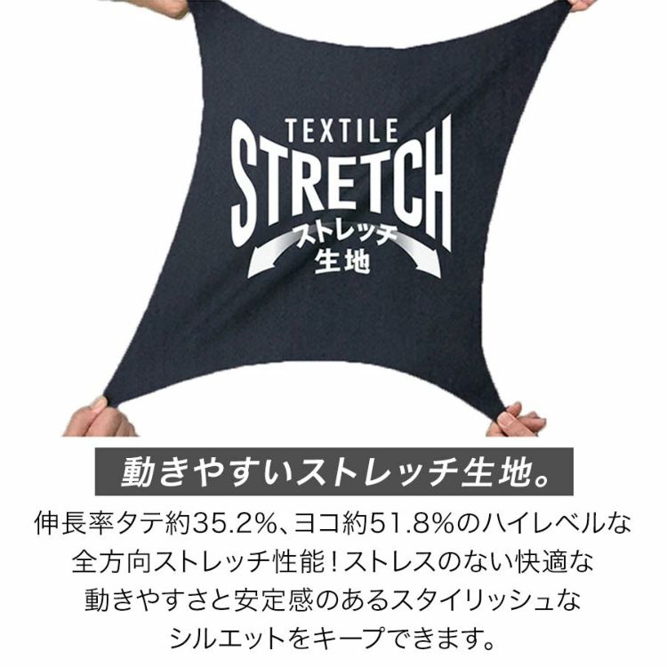伸長率タテ約32.5%、ヨコ約51.8%のハイレベルな全方向ストレッチ性を持ち、ストレスのない快適な動きやすさと安定感のあるスタイリッシュなシルエットをキープしてくれます。