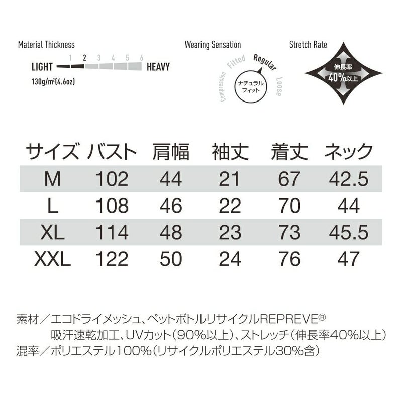 吸汗速乾加工、UVカット(90%以上)、ストレッチ(伸長率40%以上)
