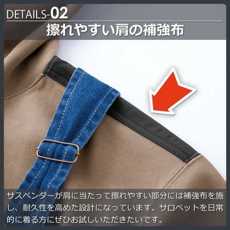 サスペンダーが肩に当たって擦れやすい部分には補強布を施し、耐久性を高めた設計になっています。サロペットを日常的に着る方にぜひお試しいただきたいです。