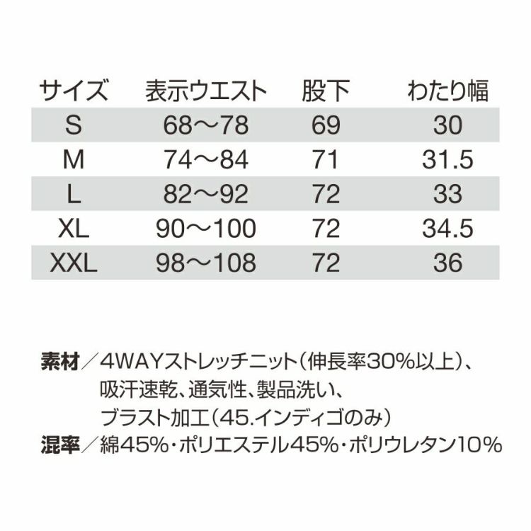 4WAYストレッチニット(伸長率30%以上)、吸汗速乾、通気性、製品洗い、ブラスト加工(インディゴのみ)