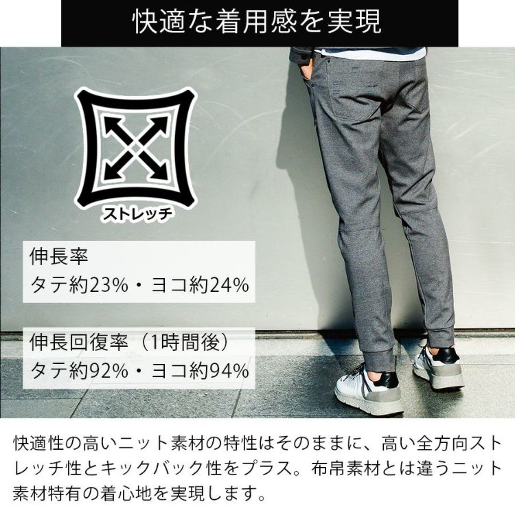 ■快適性の高いニット素材の特性はそのままに、高い全方向ストレッチ性とキックバック性をプラス。布帛素材とは違うニット素材特有の着心地を実現します。伸長率タテ約23%・ヨコ約24% 伸長回復率 (1時間後)タテ約92%・ヨコ約94%