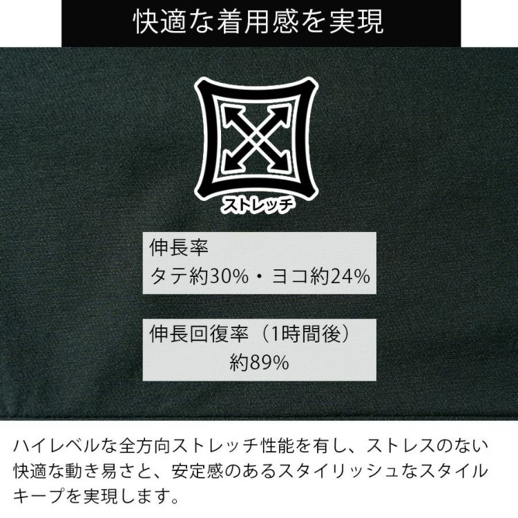 ■伸長率タテ約30%・ヨコ約24%、伸長回復率(1時間後)約89%のハイレベルな全方向ストレッチ性能を有し、ストレスのない快適な動き易さと、安定感のあるスタイリッシュなスタイルキープを実現します。