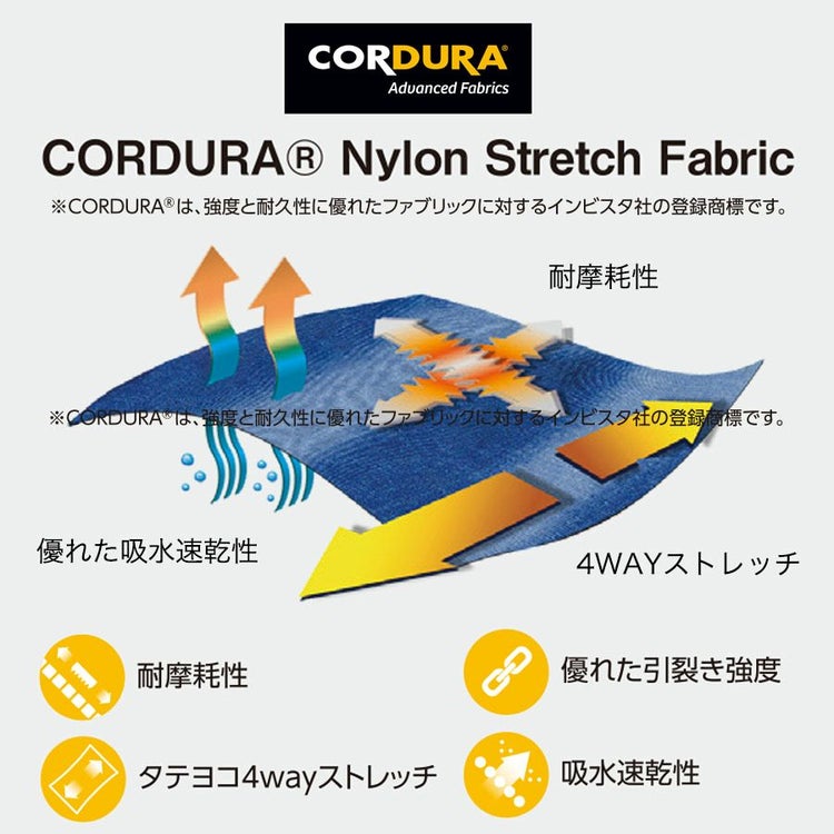 ■優れた耐久性と接触冷感(Q-max0.29)の特性を有する4WAYストレッチCORDURA素材。
