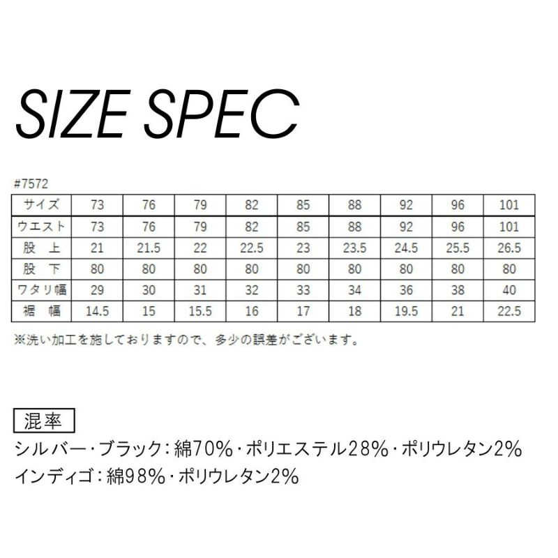 身長185cm、体重73kg、ウエスト79cmの当店スタッフが着用したところ、いつも履くパンツのウエストは79cmで、7572のパンツも79cmでジャストサイズでした!