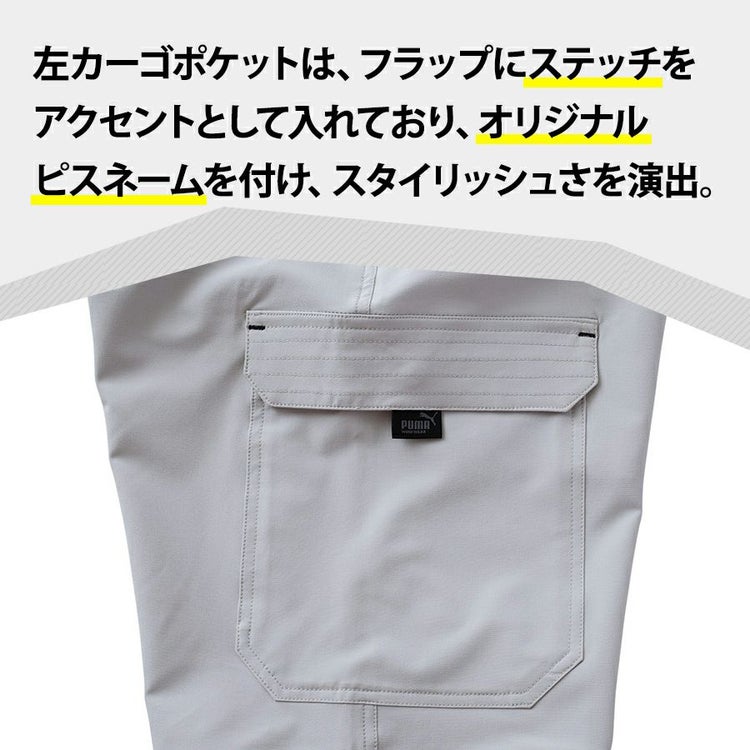 シャープなデザインでストレッチ性もあり軽量を兼ね備えたストレスフリーなPUMA WORKWEARのカーゴパンツ。