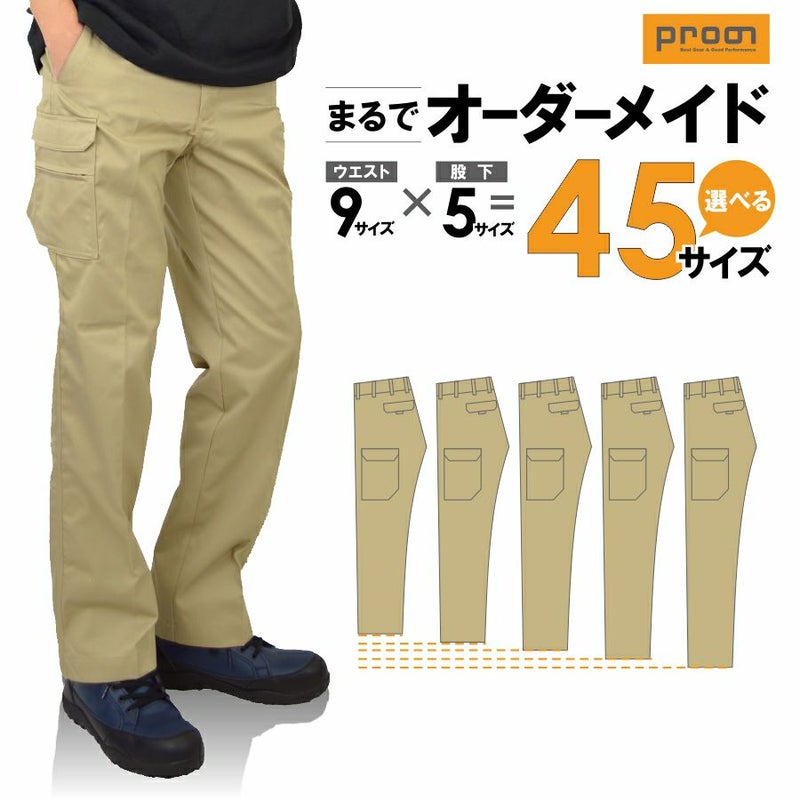 ウエスト9サイズ×股下5サイズ=計45サイズから自分にぴったりのサイズが選べるカーゴパンツ。