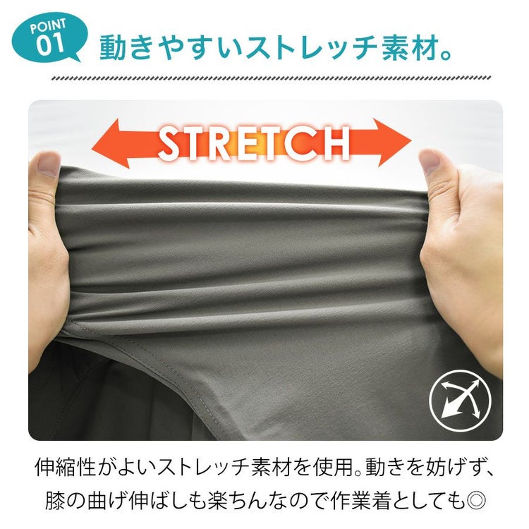 伸縮性のよいストレッチ素材で、動きを妨げす、膝の曲げ伸ばしも楽ちん。