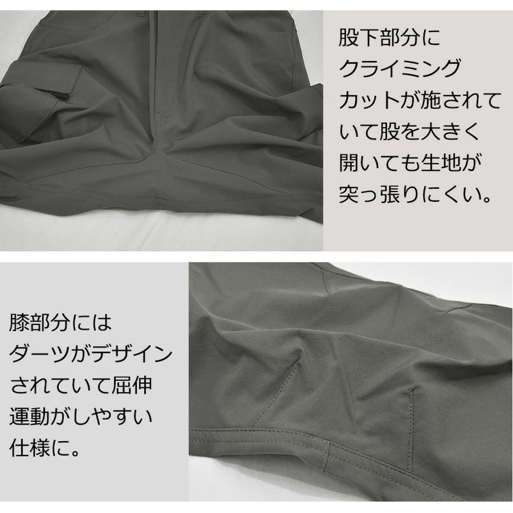 ・汗をかいてもべたつきにくい点接触の裏生地や動きやすいクライミングカット仕立て。