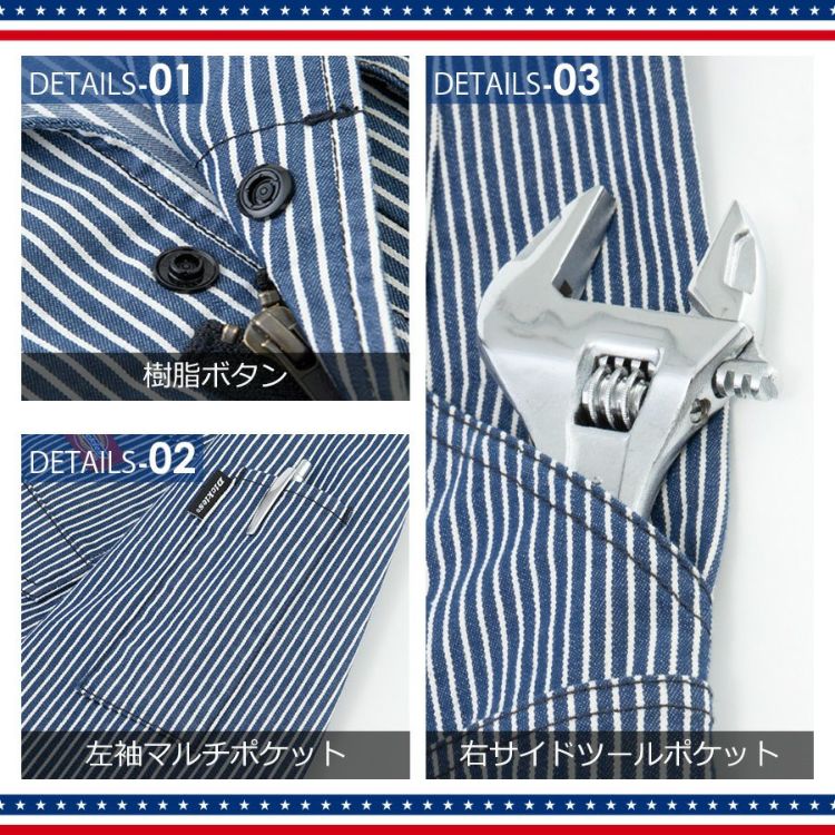 ・目を引くヒッコリー柄(ストライプ)のアメリカンテイストデザインが際立ち、作業時のみならずプライベートシーンでも着用したくなる逸品です。