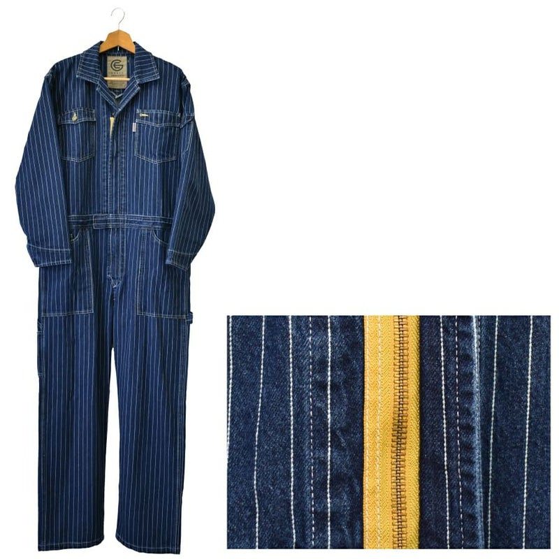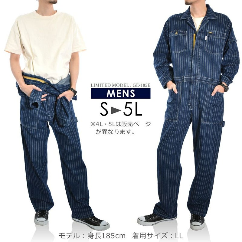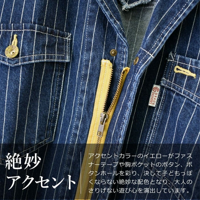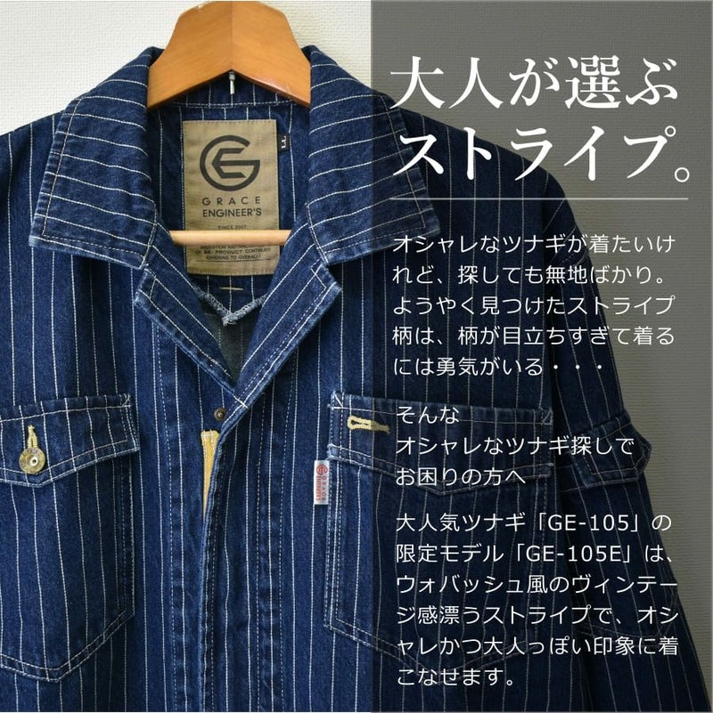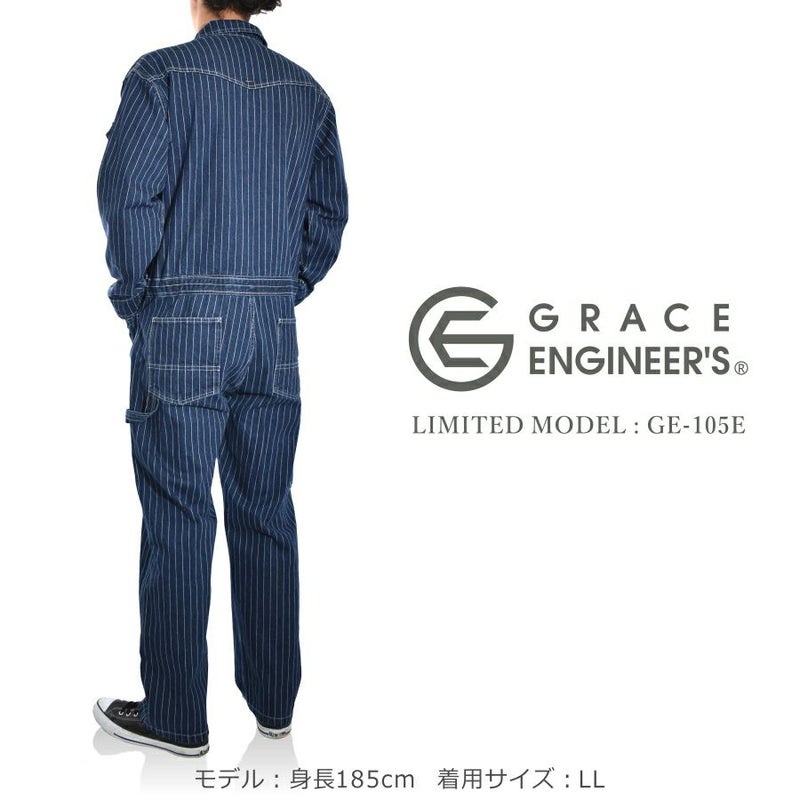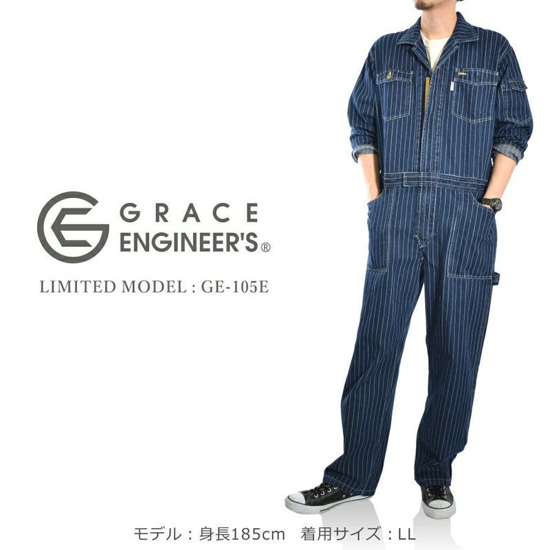 4L-5L 送料無料 限定モデル グレイスエンジニアーズ デニムストライプツナギ GE-105E メンズ レディース つなぎ ツナギ 綿100% コットン おしゃれ GRACE ENGINEER'S