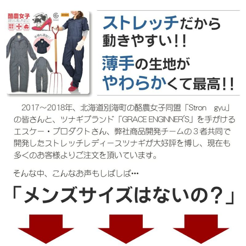 実はこの生地、北海道別海町の酪農女子同盟「ストロン・ギュウ」様と当店プロノ、「GRACE ENGINEER'S」を手がけるツナギメーカー「エスケー・プロダクト」様がコラボして開発し、そのデザイン性と動きやすさがSNSでも話題となって大人気を博しているGE-190レディースストレッチツナギと同じ生地を使ったツナギなんです。
