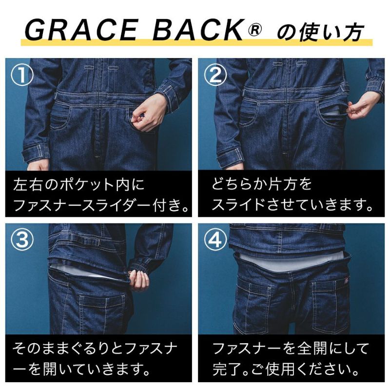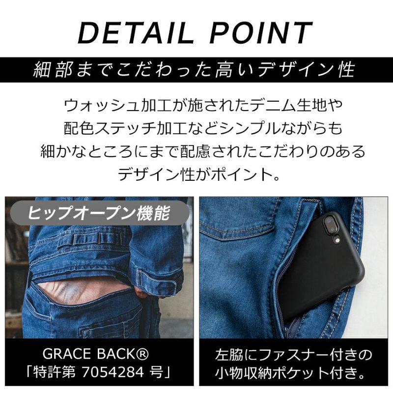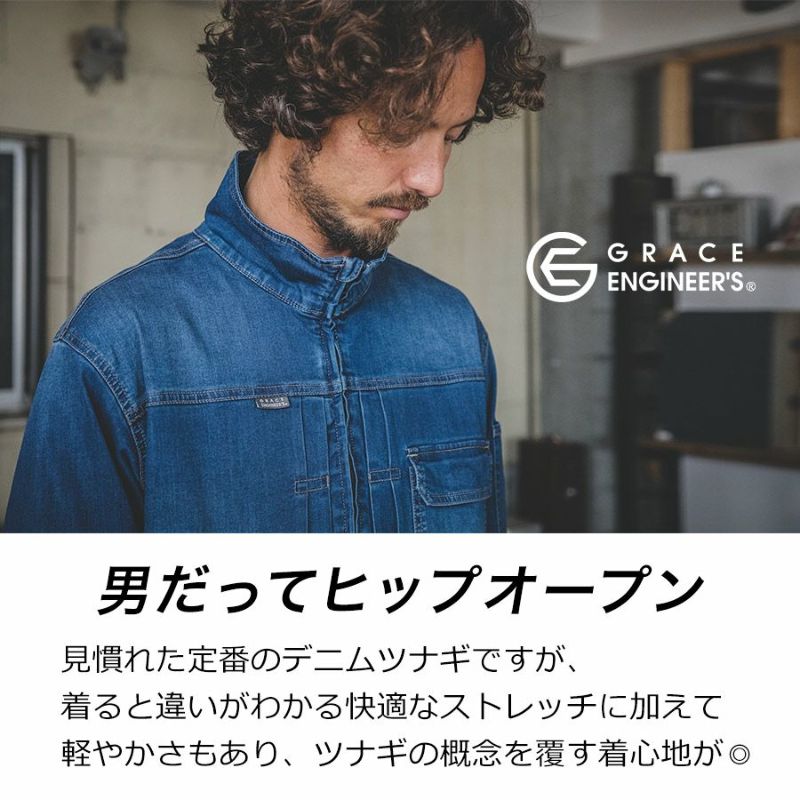 ツナギ つなぎ 男性 メンズ デニム でにむ 綿 ライトデニム ヒップオープン ヒップオープン機能 多機能ポケット M L LL 3L 仕事 作業着 作業 ワークウェア 現場 DIY キャンプ 釣り バイク ツーリング 防災 作業 アウトドア GRACE BACKR 特許第 7054284 号 20代 30代 40代 50代 60代 秋冬 冬 GRACE ENGINEER'S グレイスエンジニアーズ