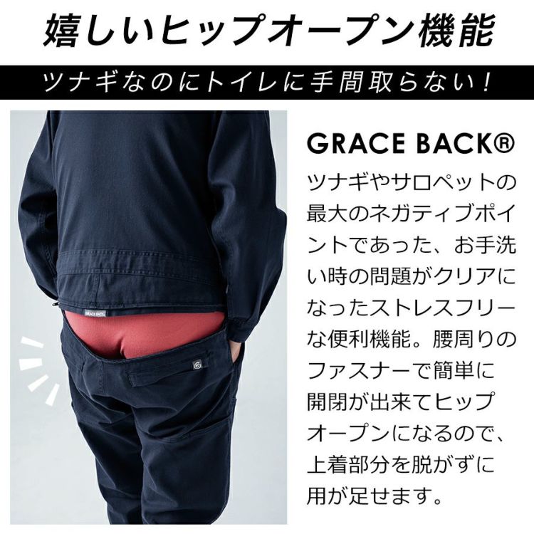 ツナギ つなぎ 男性 メンズ 綿 コットン ヒップオープン ヒップオープン機能 多機能ポケット M L LL 3L 仕事 作業着 作業 ワークウェア 現場 DIY キャンプ 釣り バイク ツーリング 防災 制服 ユニフォーム 作業 アウトドア GRACE BACK 特許第 7054284 号 20代 30代 40代 50代 60代 春夏 SS 春 秋 GRACE ENGINEER'S グレイスエンジニアーズ