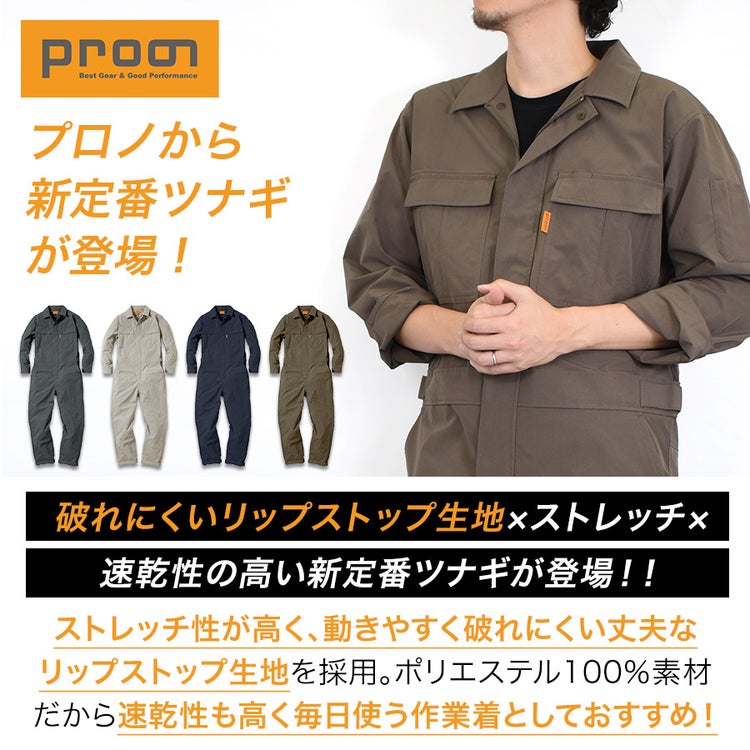 プロノ リップストップストレッチツナギ PR-2602 年間 つなぎ オーバーオール メンズ 作業服 作業着 メカニック 整備 車 バイク 農業 畑 DIY