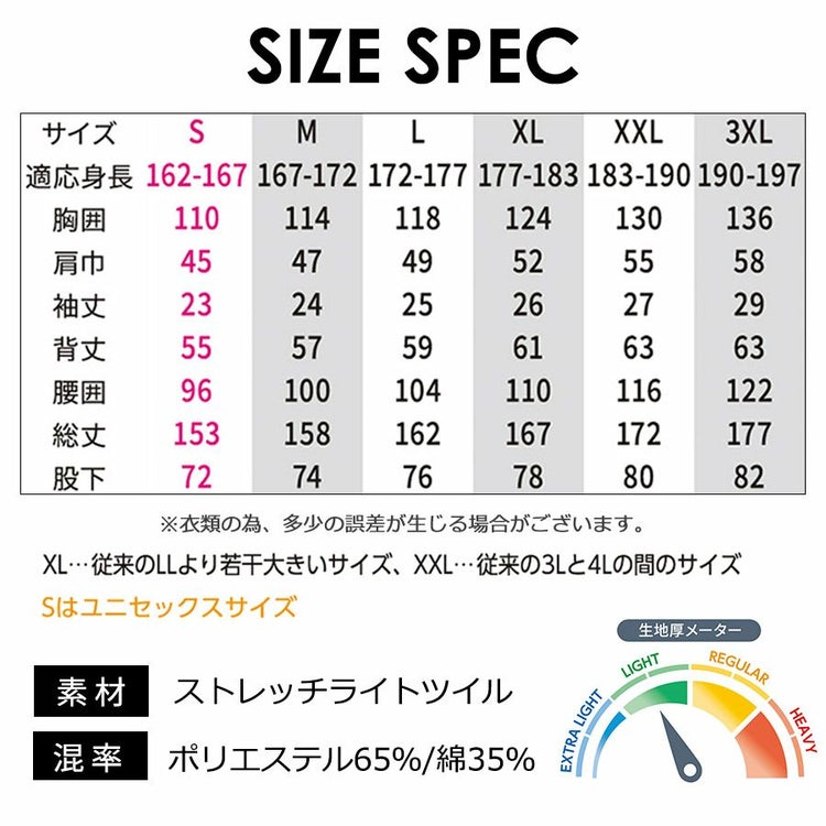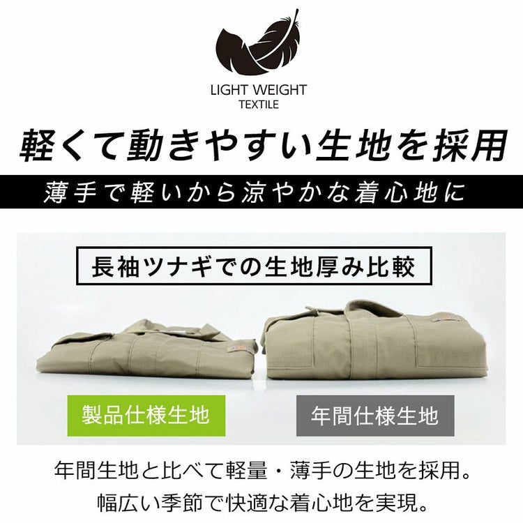 薄手で軽いから涼やかな着心地を実現しました。 年間生地と比べて軽量・薄手の生地だから通気性が良くツナギなのに重たく感じないのも魅力です。