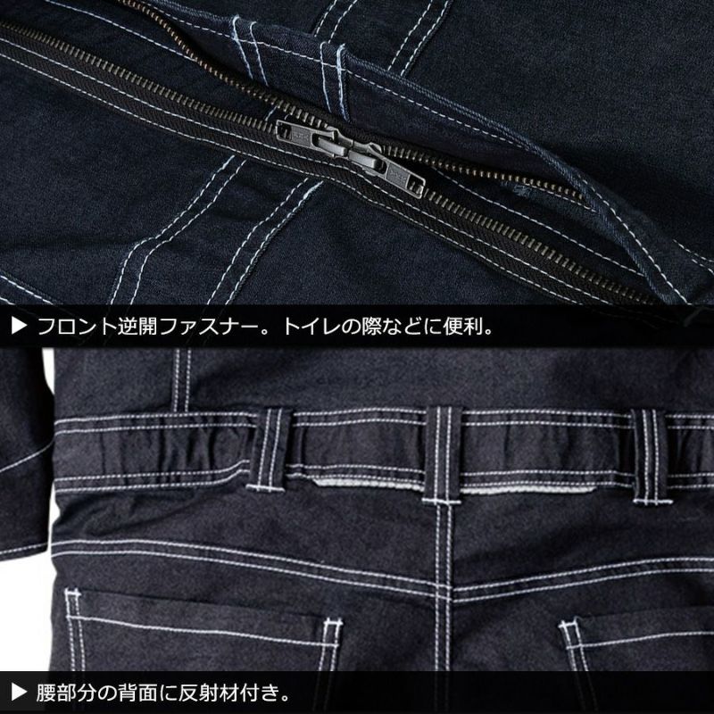 伸長率ヨコ30%のアメイジングストレッチで、デニムのかっこよさはそのままに、突っ張らず着やすいつなぎです。